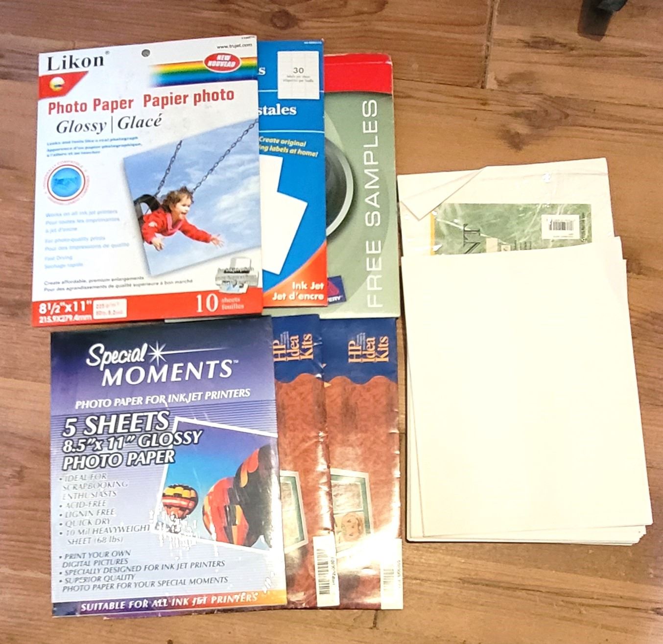 APPROX 10 SHEETS OF 8.5 X 11 PARCHMENT PAPER, 2 HP PROJECT IDEAS, DOZENS OF AVERY BUSINESS CARD LABELS, AND SOME AVERY SAMPLES OF DIFFERENT SIZES OF LABELS & 2 PKGS OF 4 X 6" GLOSSY PHOTO PAPER FOR INKJET PRINTERS. STATIONARY