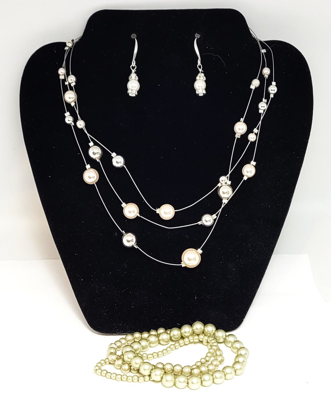 STRAND FLOATING NECKLACE, 3 GRADUATING SIZES BRACELETS AND PEARL WITH CRYSTAL RONDELLE ACCENTS DROP EARRINGS. JEWELLERY