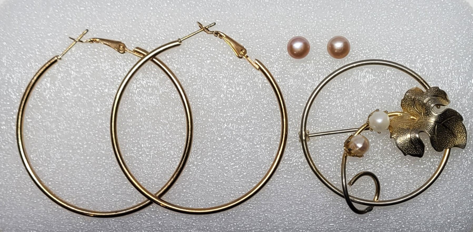 INCLUDING CIRCLE BROOCH WITH BRUSHED GOLD LEAF AND 2 PEARLS, ONE WHITE & ONE CHAMPAGNE, MATCHING CHAMPAGNE STUD EARRINGS AND GOLD TONE HOOP EARRINGS