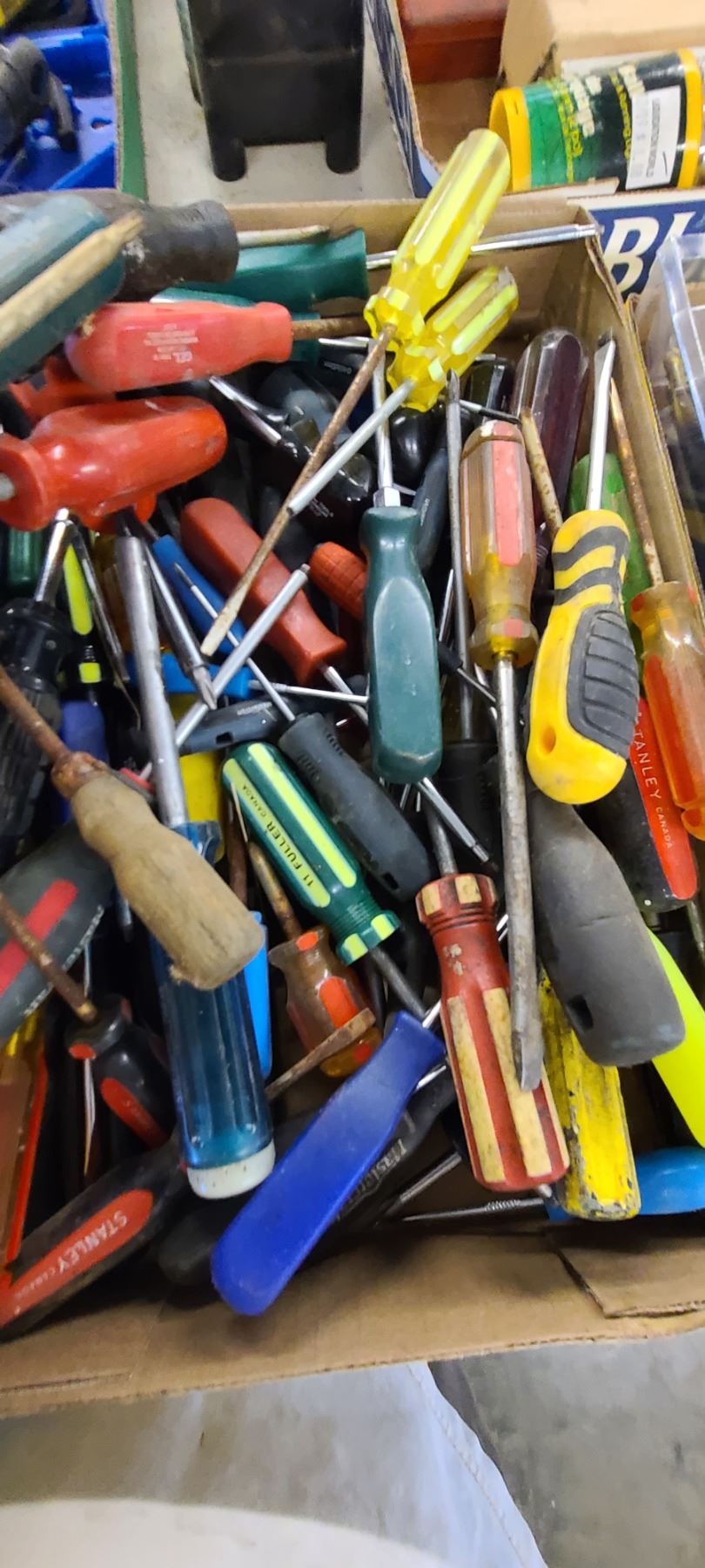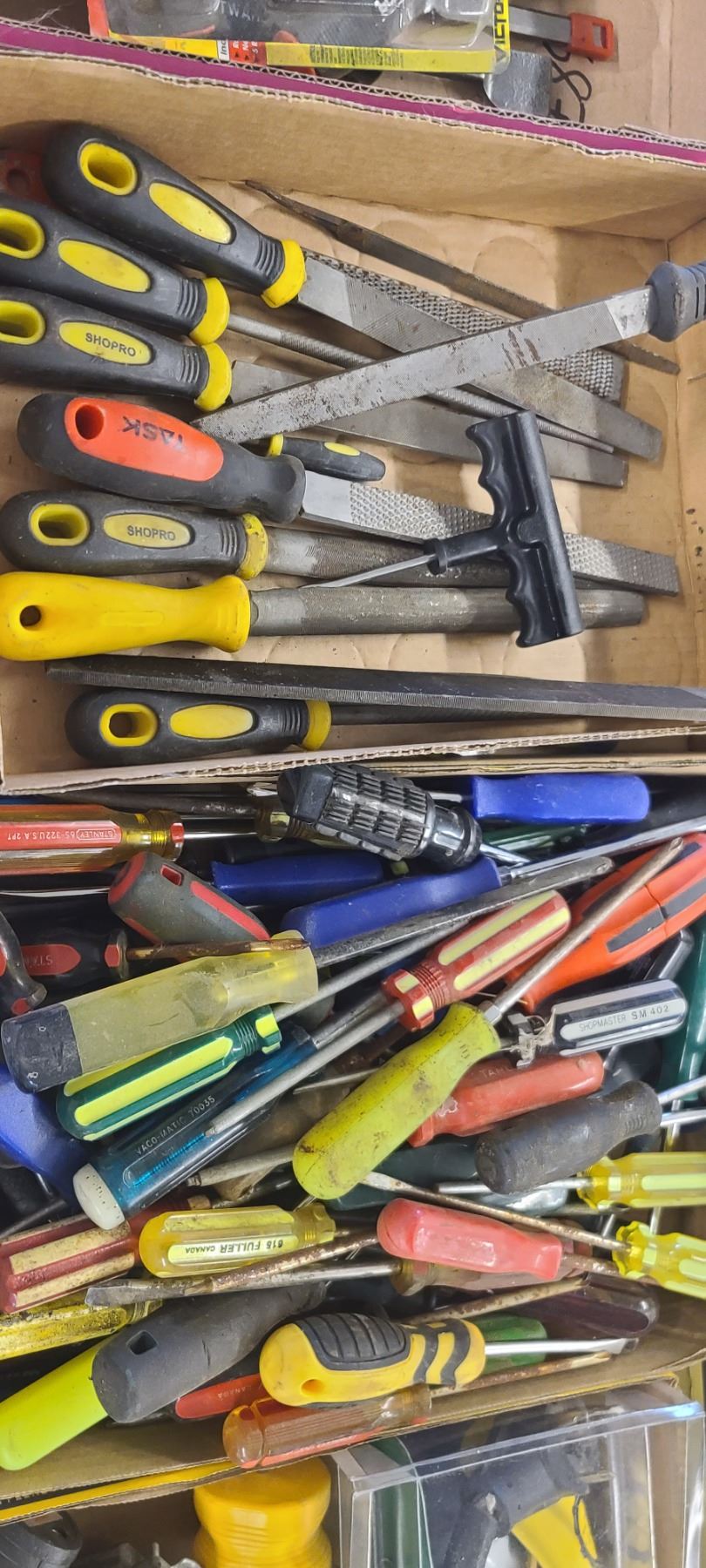 1 LOT: RASPS & FILES + A FLAT OF LARGE ASSORTMENT OF SCREWDRIVERS.