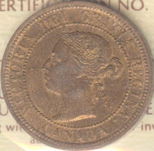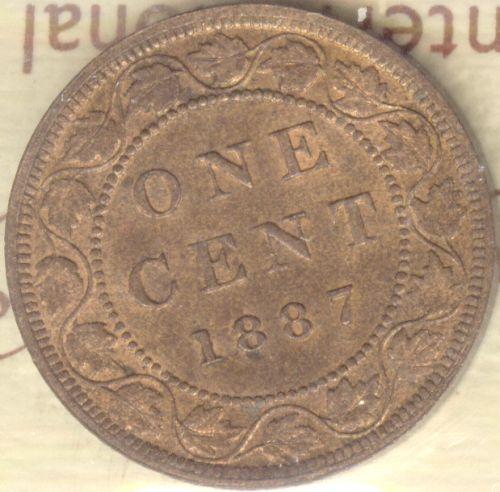 1 Large Cent 1887, ICCS certified MS-63; Red & Brown. Not noted on the certificate is Doubled 87. Interesting variety.