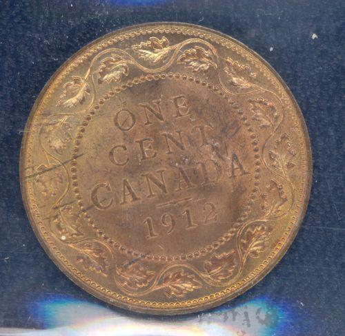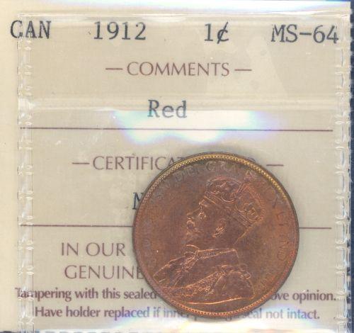 1 Large Cent 1912, ICCS certified MS-64 Red, Full Red has qualities of 65 without spot.