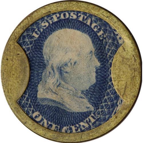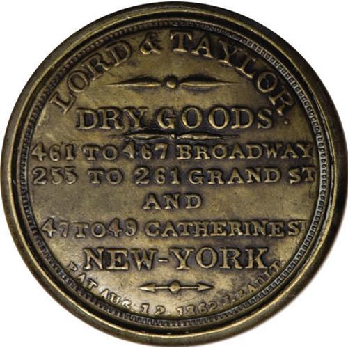 <B>1¢ Lord & Taylor "Romain" Counterfeit.</B></I> Created in the 1960's and sold by either their creator or his agents into the numismatic marketplace. The cases are reasonably good fabrications, duplicating four different merchants. These are Lord & Taylor, Kirkpatrick & Gault, Take Ayer's Pills and Ayer's Sarsaparilla (Medium Ayer's.) Although reasonably deceptive, after just a little bit of studying these fakes, no one should be fooled. The cases are generally quite dark, sometimes giving the appearance of toned, silvered pieces. They are a slightly different shape and size both face and back. The tabs are shaped differently, as is the front of the frame. Each merchant has definitive telltale characteristics that can be easily spotted once they are known. The only thing genuine in these "Romain" fakes is the stamp. The mica is not mica, but a modern plastic. It is always crystal clear, with a high gloss to the surface. They are covered and illustrated on page 449 of Fred Reed's book. Mr. Mayer had three of the four different merchants, lacking only a Take Ayer' Pills, which we have also photographed with this group to help with the identification of these modern fakes. This first example of Mr. Mayer's is a One Cent Lord & Taylor. We have seen these sell as fakes for several hundred dollars (and also as real for thousands), as most collectors want at least one as a sample. <I>Bank Note Reporter </B></I>recently ran an exhaustive study of these pieces authored by Fred Reed.<BR><I>From The Frederick Mayer Collection</B></I><BR><BR><b>Shipping:</b> Coins & Currency (<a target="_blank" href="http://www.heritageauctions.com/common/shipping.php">view shipping information</a>)