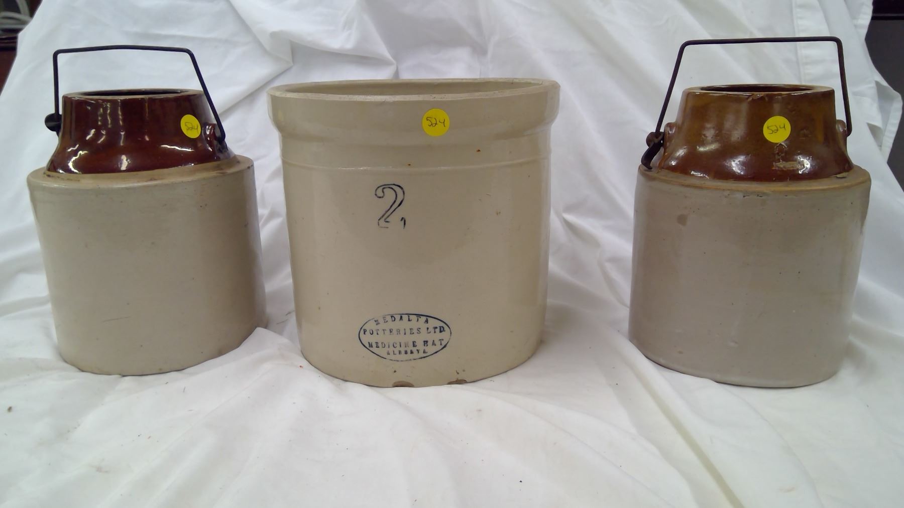 1- MEDALTA 2 GALLON CROCK & 2 PICKLE JARS