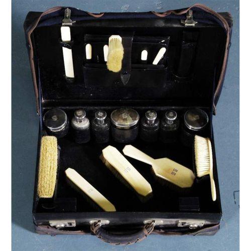 1 MEN'S TRAVEL CASE, case and<BR>elements with "S.G" monogram,<BR>includes silver capped jars<BR>and ivory brush set<BR>late 19th century <BR>CONDITION REPORT: appears complete, scuffs to outside of case.<BR>PACKING AND SHIPPING - see recommended.