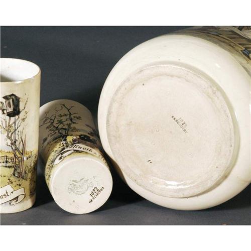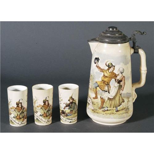 1 METLACH CIDER PITCHER with three tumblers 13" high- pitcher, 5" high-tumblers PACKING AND SHIPPING (excluding insurance) by Fairfield Auction to points within the Continental U.S.A. (international must be handled by 3rd party shipper) $40. CONDITION REPORT: some staining, pitcher with spider lines on interior, handle bent, one tumbler with lip chip and hairlines.