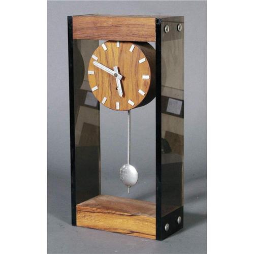 1 MODERN LUCITE AND ROSEWOOD MANTLE CLOCK stamped "Trend Clocks" on back of springwound brass movement 17" high circa 1970 PACKING AND SHIPPING (excluding insurance) by Fairfield Auction to points within the Continental U.S.A. (international must be handled by 3rd party shipper) $40. CONDITION REPORT: excellent with some oxidation to hands.