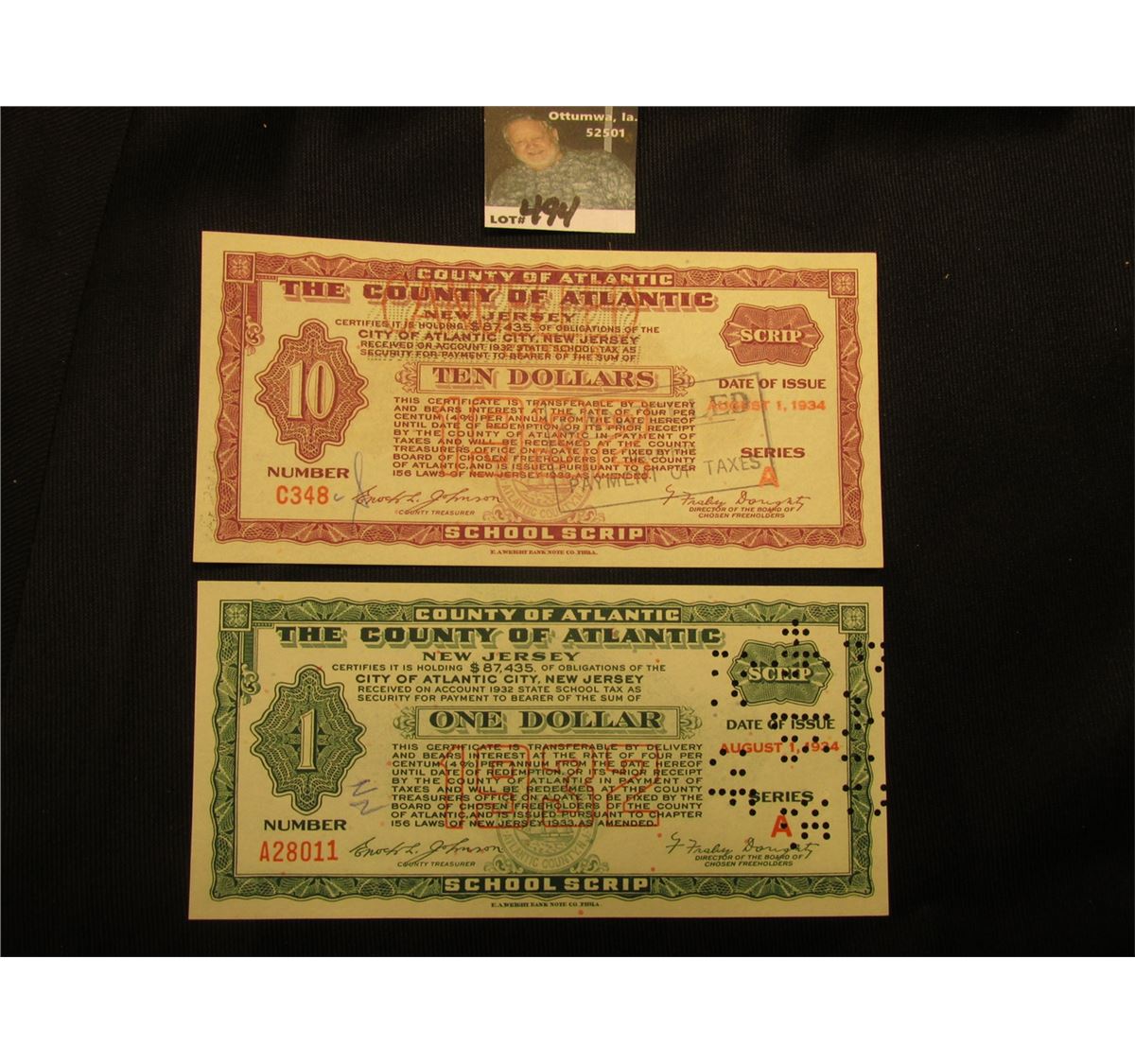 $1 MS #: NJ165-1 (hole cancelled) & $10 NJ165-10 (not hole cancelled) (This latter is the next note in rotation after Rod's illustrated plate note (depressionscrip.com), this is note # C348)County of Atlantic New Jersey Depression Scrip, hole cancelled & signed by Enoch Lewis "Nucky" Johnson (January 20, 1883 – December 9, 1968) was an Atlantic City, New Jersey political boss and racketeer. He was the undisputed "boss" of the political machine that controlled Atlantic City and the Atlantic County government from the 1910s until his conviction and imprisonment in 1941. His rule encompassed the Roaring Twenties when Atlantic City was at the height of its popularity as a refuge from Prohibition. In addition to bootlegging, his organization also was involved in gambling and prostitution. Both of these notes are Crisp Uncirculated.