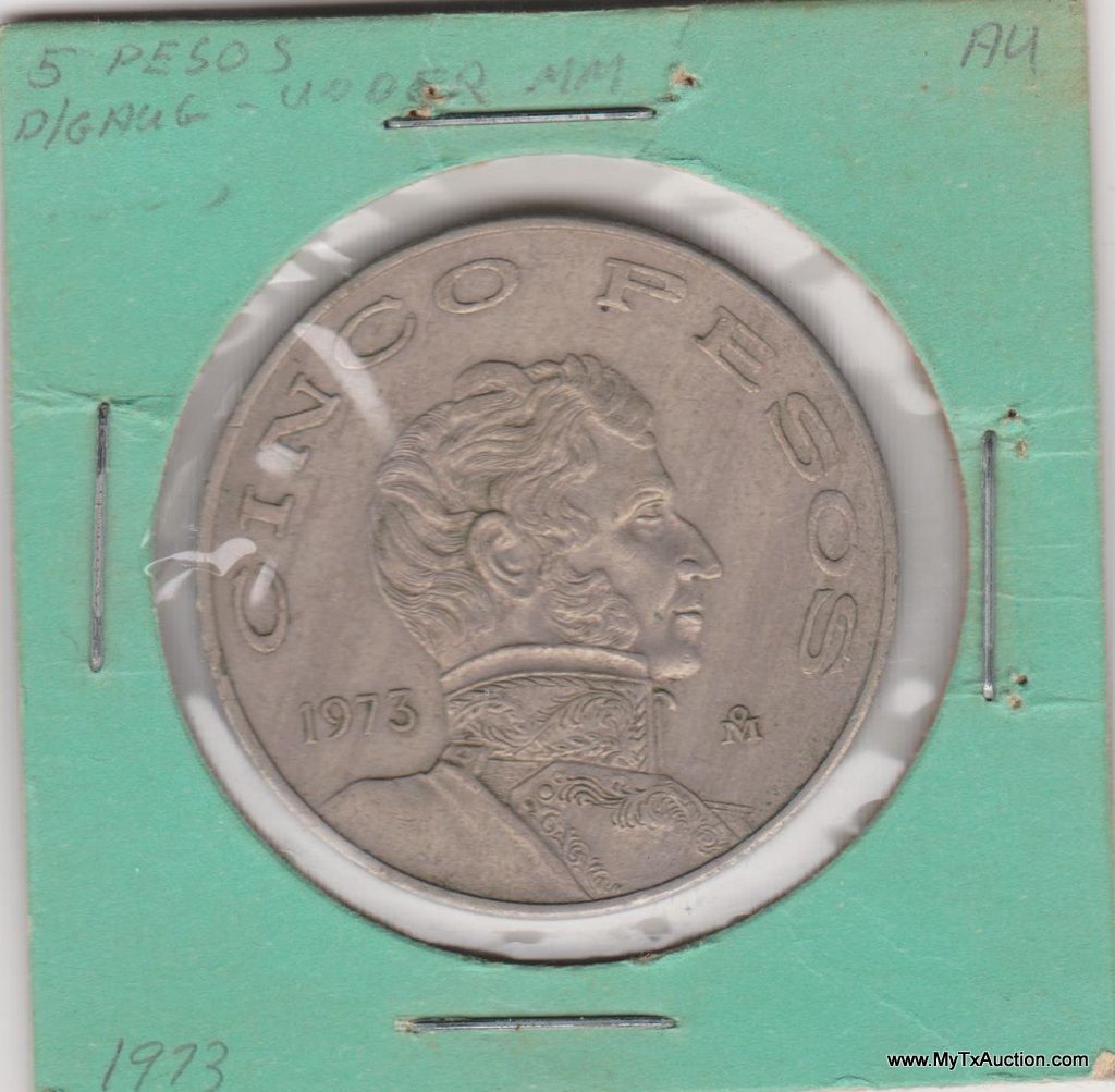 1-1973 5 Pesos Country:Mexico - Coin Mint Years:1971-1978 - Metal:Copper-nickel - Weight:14.04g - Diameter:32.9mm - Thickness:2.13mm - Design Obverse:National Arms (Eagle on cactus facing left with snake in beak above wreath), with the inscription forming a semicircle above it Lettering: ESTADOS UNIDOS MEXICANOS - Reverse:Value, Portrait of Vicente Guerrero to the right Lettering:CINCO PESOS 1973 M - Engravers:Unknown - Shape:Round - Edge:Smooth with inscription Lettering: INDEPENDENCIA Y LIBERTAD