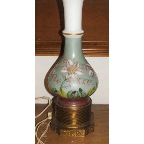 unsigned. Mid 20th century. Milk glass with a metal base. 17"high each