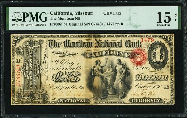 One $1 Moniteau Bank of California MO PMG 15NET.