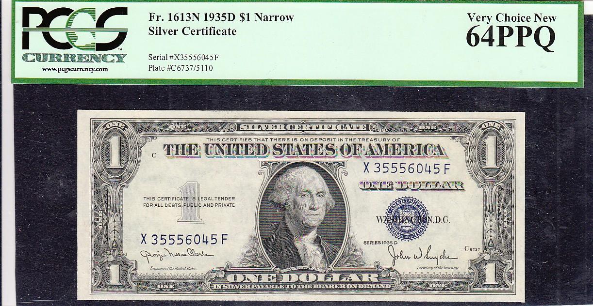 $1 NARROW SILVER CERTIFICATE 1935d PCGS 64 PPQ
