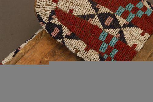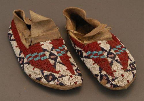 1 NATIVE AMERICAN BEADED MOCCASINS with red beaded points, small area of loss, packing and shipping $20
