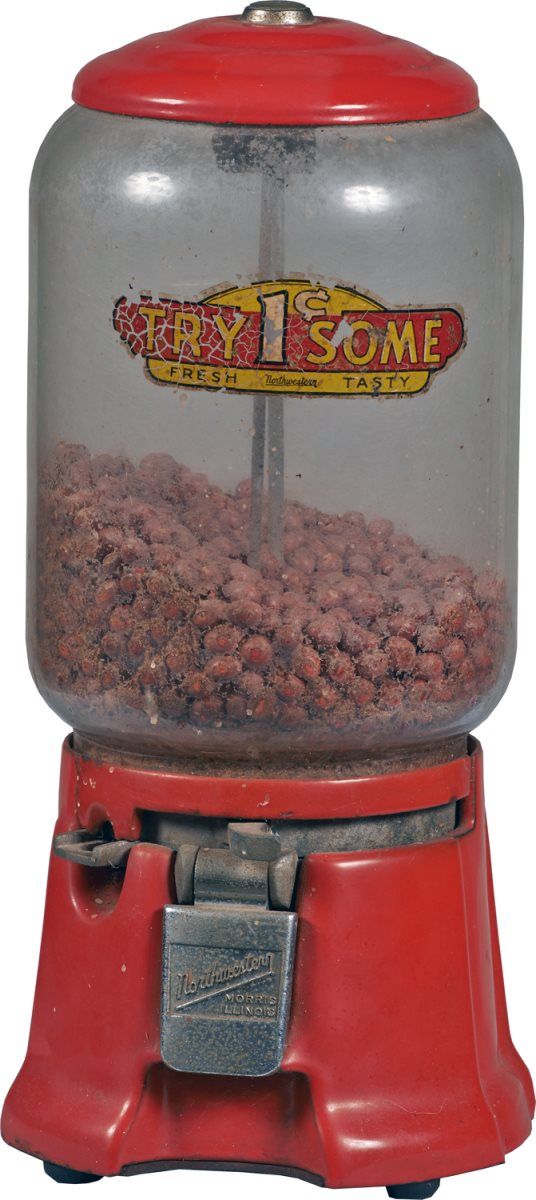 Circa 1939. Red porcelain base and lid with 1 ¢ "Try Some Fresh and Tasty" decal on glass globe. Condition (Very Good). Size 15" x 7".