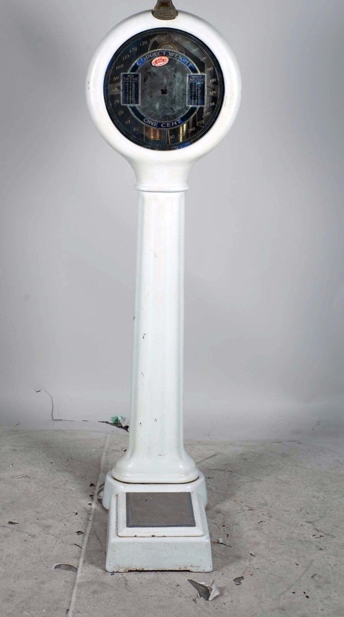 "Correct Weight One Cent" with front round mirror, Not working, No key Condition (Good). Size 19-1/2" x 24" x 68"h