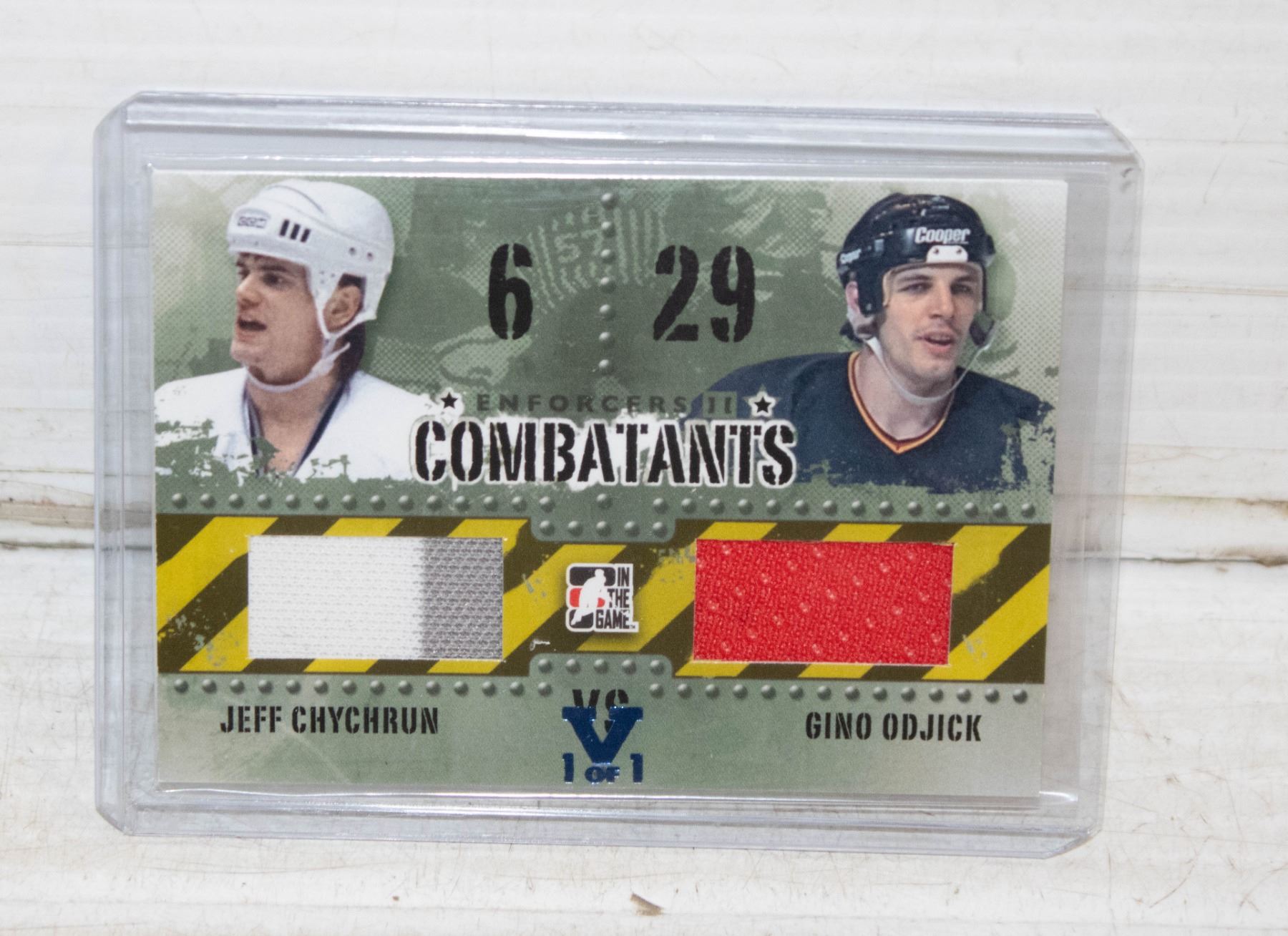 ODJICK #29 - FROM THE ENFORCERS II SERIES BY IN THE GAME, INC. ON THE FRONT OF THIS CARD ARE PIECES FROM A GAME-USED JEFF CHYCHRUN LOS ANGELES KINGS JERSEY & A GAME-USED GINO ODJICK VANCOUVER CANUCKS JERSEY. IN A CLEAR PLASTIC CARD HOLDER SLEEVE C-32