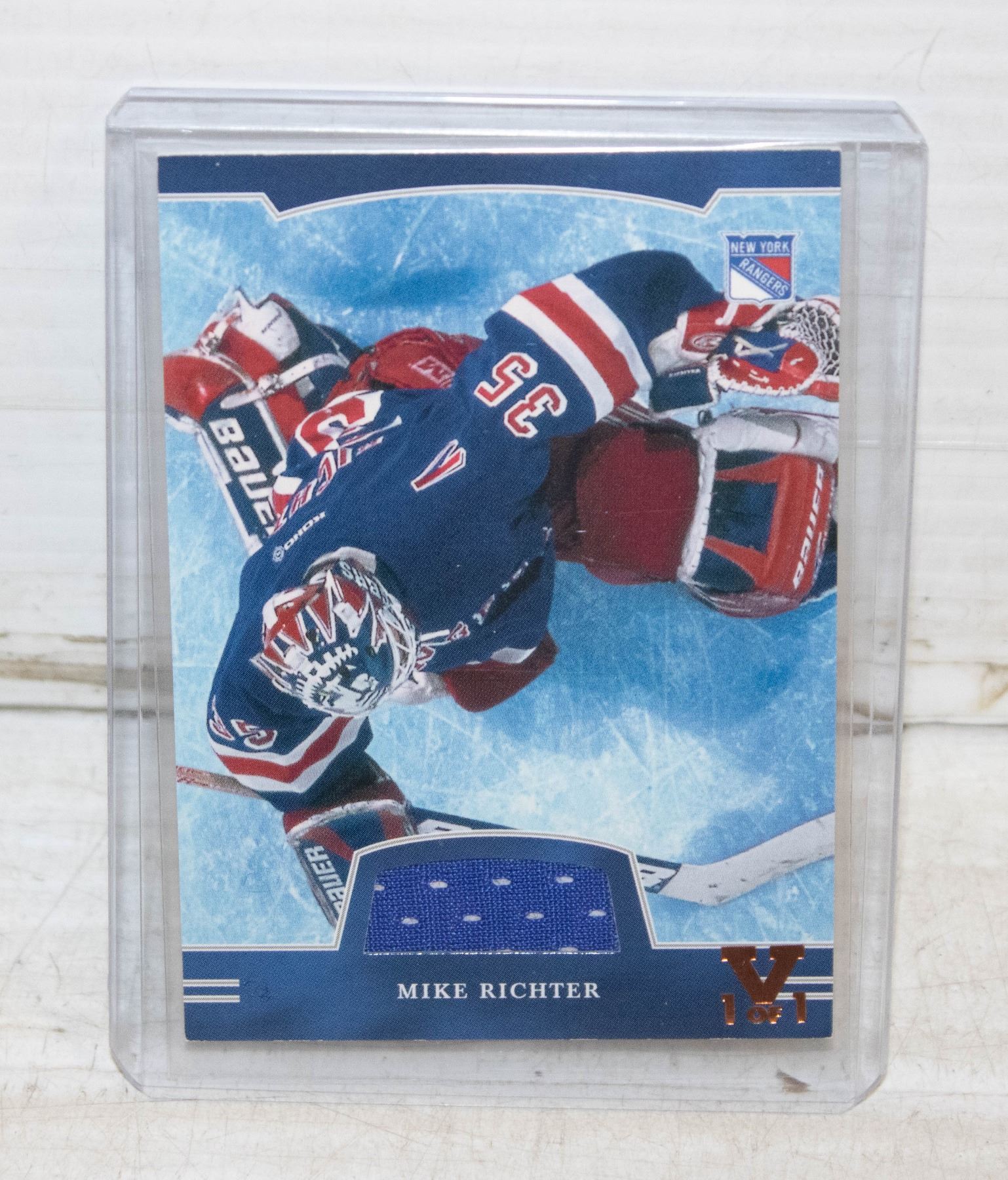 JERSEY CARD FROM THE 2002-2003 BE A PLAYER FIRST EDITION SERIES. ON THE FRONT OF THIS CARD IS A PIECE OF GAME USED MIKE RICHTER NEW YORK RANGERS JERSEY FE-128 IN A CLEAR PLASTIC CARD HOLDER SLEEVE
