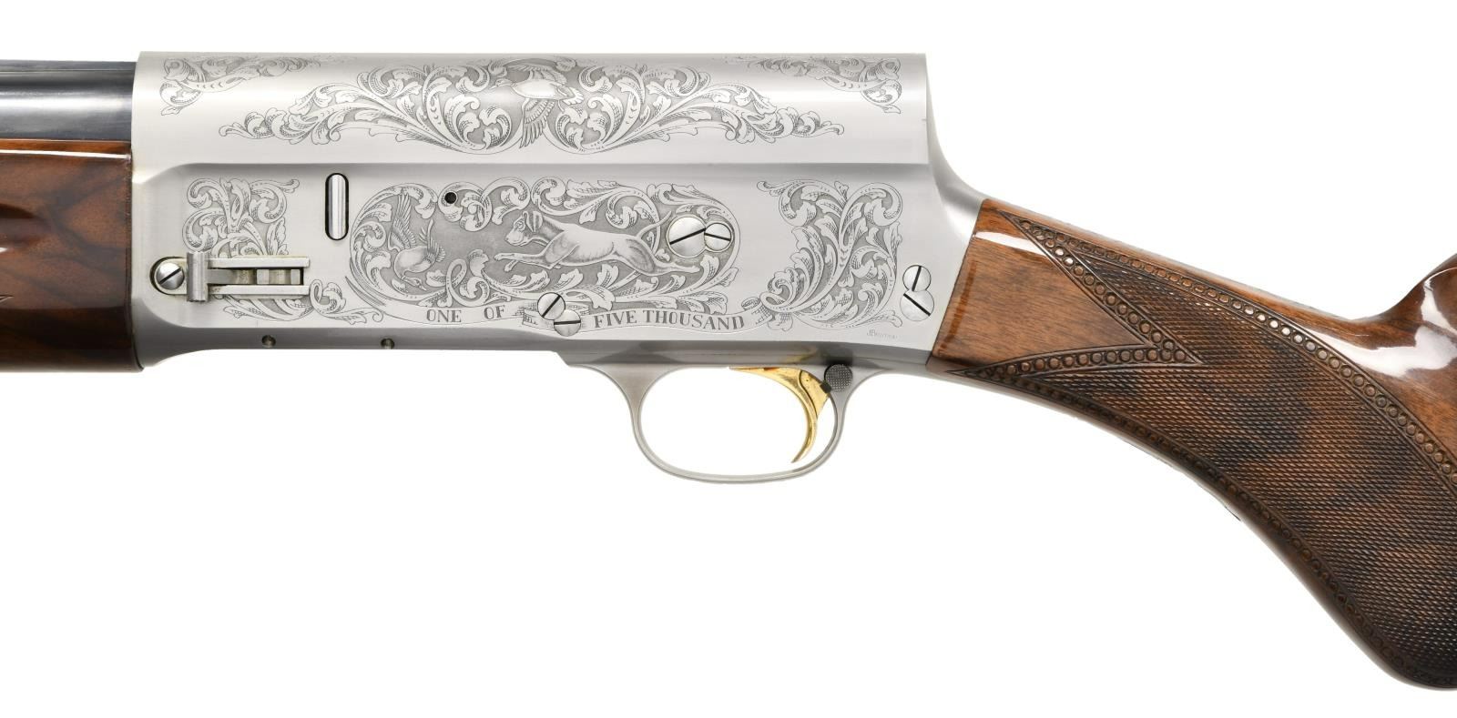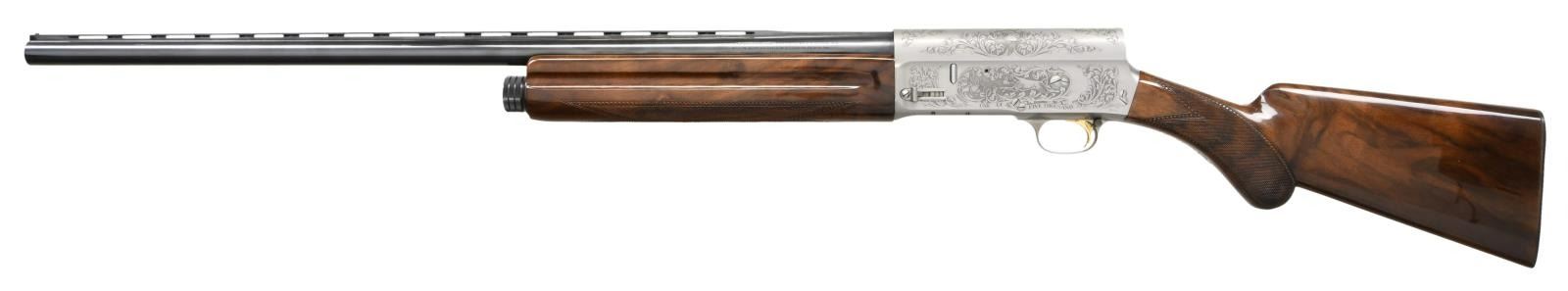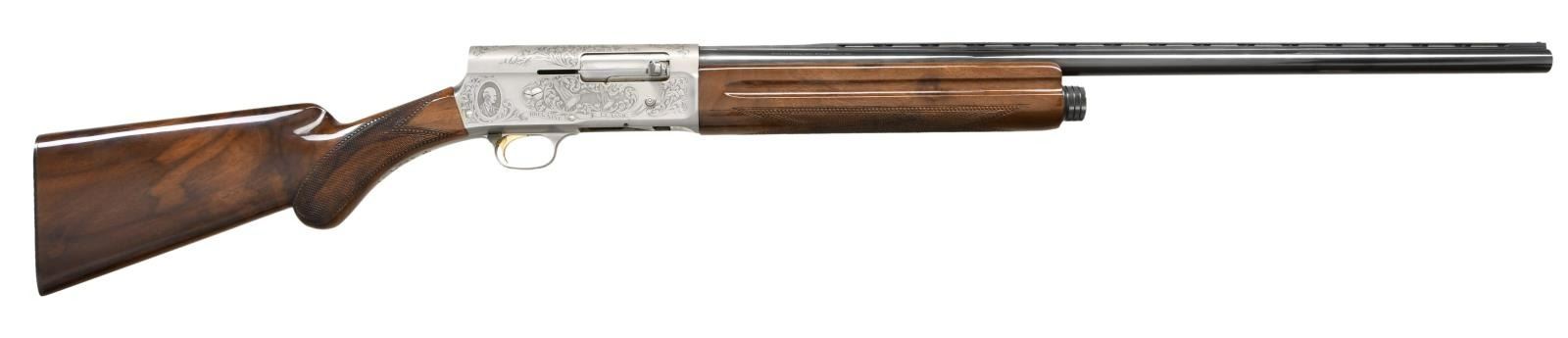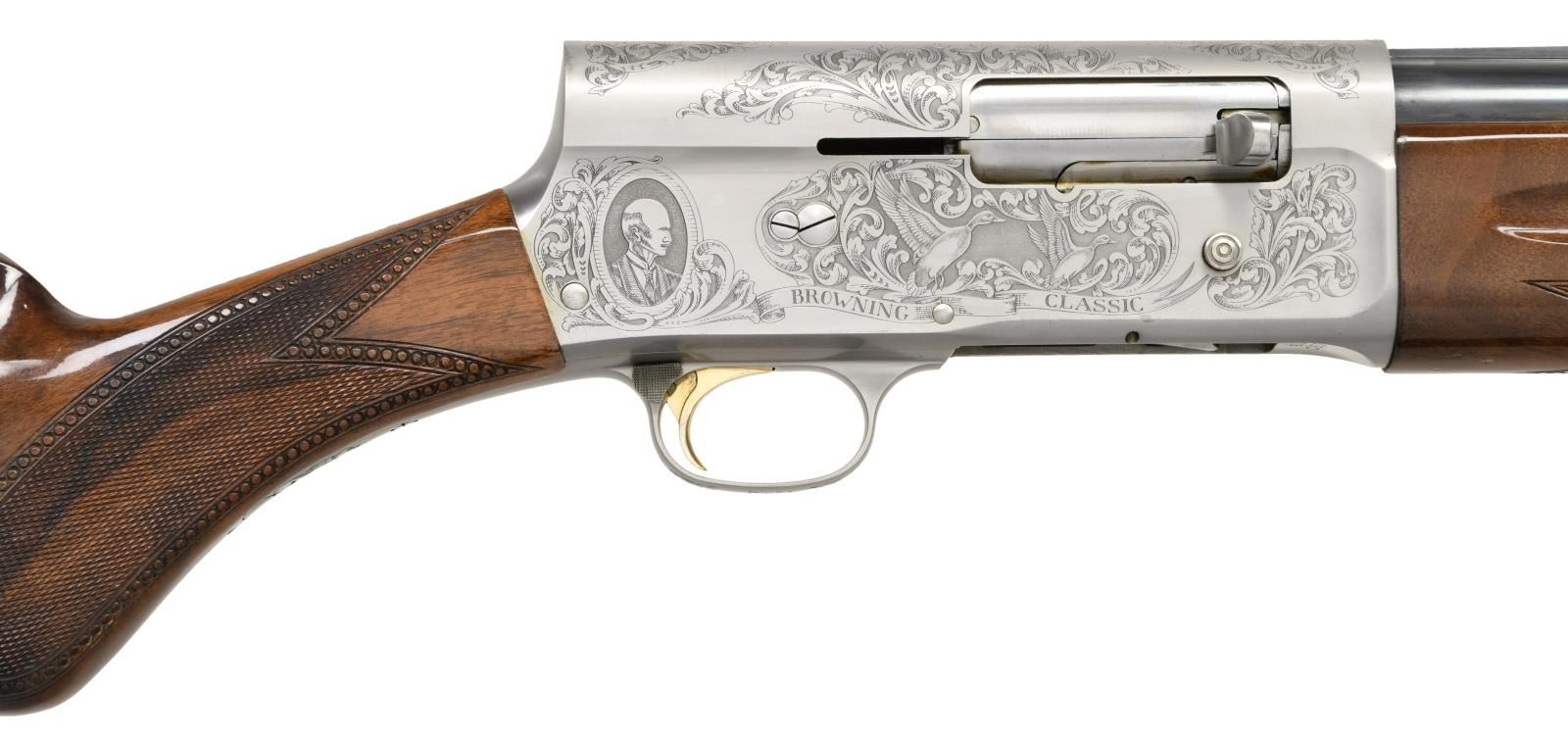 SHOTGUN. Cal. 12 GA, 2 3/4". S# 211BC1636. Bbl 28". A5 Classic semi-automatic shotgun manufactured in Japan, engraved by Fabrique Nationale in Belgium, and imported/retailed by Browning Arms Company of Morgan, TH & Montral P.Q. The left side of the bbl. is marked with Browning's importer information above "MADE IN JAPAN - ENGRAVED IN BELGIUM BY FN HERSTAL", with the cal. designation on the right. The left side of the receiver exhibits acanthus leaf scroll engraving with a duck above a scene of a running dog and "ONE OF FIVE THOUSAND" within a banner, with the right side exhibiting matching scroll engraving, with a portrait of John Moses Browning and 2 ducks above a banner reading "BROWNING CLASSIC". The left side of the receiver is signed "J.BELLEFROID". The receiver features a French gray finish, with the vent rib bbl. being blued. Checkered wood round knob buttstock with beaded borders, "AUTOMATIC", "FN", "BROWNING" marked buttplate, and checkered wood forend with matching beaded borders. CONDITION: extremely fine, with metal components retaining bountiful amounts of their original factory finishes overall. Mirror bore. Wood furniture shows some small impressions and a few marks from handling and storage, but is otherwise very good overall. PROVENANCE: The Collection of Gun Sport Ltd. owned by Jon R. Thomas. (23-3705/MLW). MODERN. $1,000-1,500.
