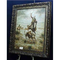 1 OIL PAINTING-COWBOY DRIVING 40" X 30".