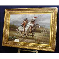 1 OIL PAINTING-TROY DENTON MOUNTED INDIANS ONE HOLDS FLAG AND WEARING CAVALRY HAT. 24" X 36".