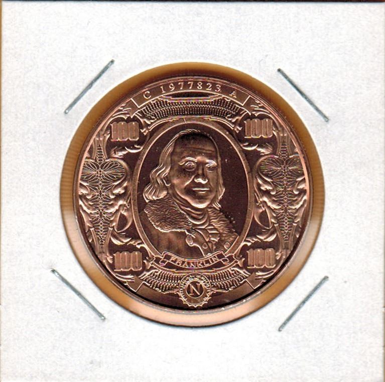 1 OUNCE COPPER - .999 FINE - UNITED STATES BENJAMIN FRANKLIN $100 BILL DESIGN