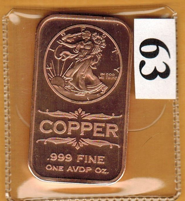 1 OUNCE COPPER BAR .999 FINE - WALKING LIBERTY DESIGN