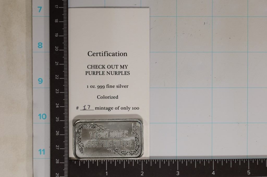 OF 100 MINTED, WITH CERTIFICATE, BRAND NEW IN HARD PLASTIC CAPSULE, COLORIZED ON ONE SIDE. ''CHECK OUT MY PURPLE NURPLES''