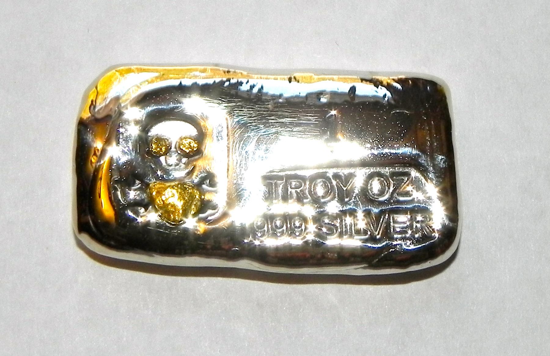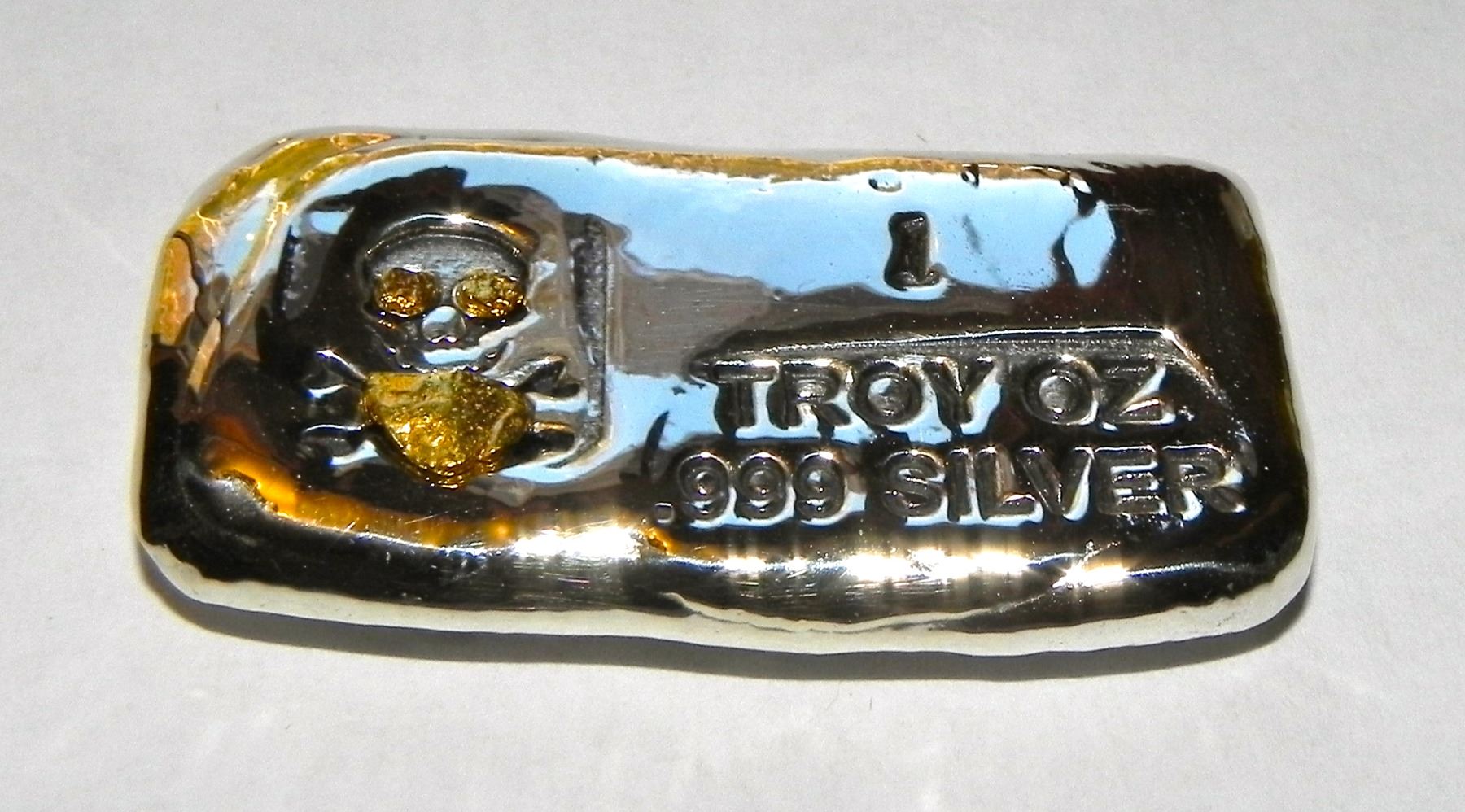 1 OZ Silver Buccaneer bar hand poured from Porcupine Creek silver with Gold Nuggets from TV show Gold Rush