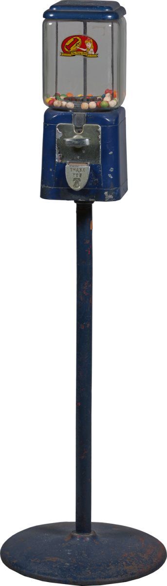 On cast Iron stand. Circa 1950. Square globe with "1 ¢ The Very Best" decal. Blue cast aluminum base and lid. Condition (Very Good). Size 46-3/4" x 6-1/2" x 6-1/2".