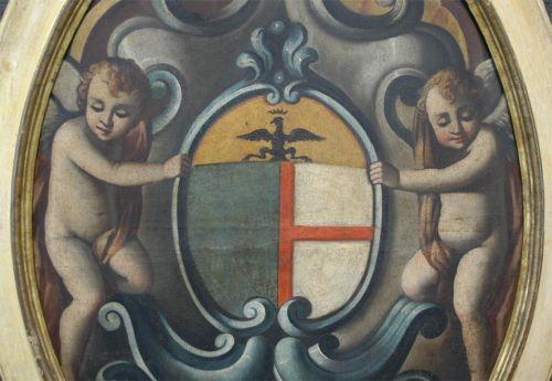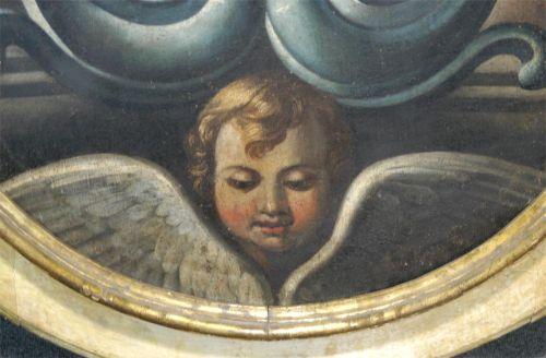 1 PAINTED ITALIAN FAMILY CREST, 49"x37" oil on canvas, depicting the Santini family crest of Tuscany, in the original painted frame, 18th century,