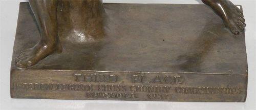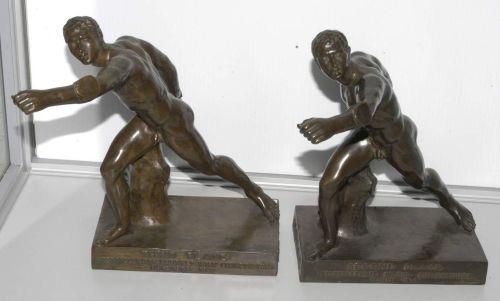 1 PAIR OF ART DECO BRONZE ATHLETES, used as track trophies, 11" high, 1937, CONDITION: EXCELLENT, PACKING AND SHIPPING (excluding insurance) AVAILABLE WITHIN CONTINENTAL U.S. BY FAIRFIELD AUCTION FOR $70 . BUYER MAY ALSO PICK-UP OR USE A 3RD PARTY FOR PACKING AND SHIPPING