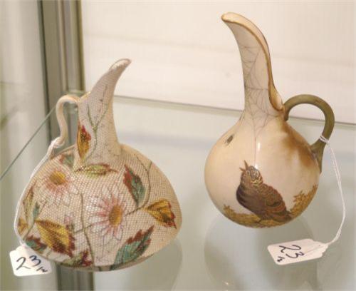 1 PAIR OF CRUETS, a Nippon textured ewer with fleck and an English aesthetic movement ewer with spider web, packing and shipping $20