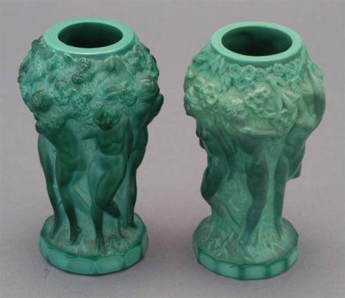 1 PAIR OF CZECH MALACHITE GLASS VASES with round acid etched mark, 5" high, packing and shipping $30