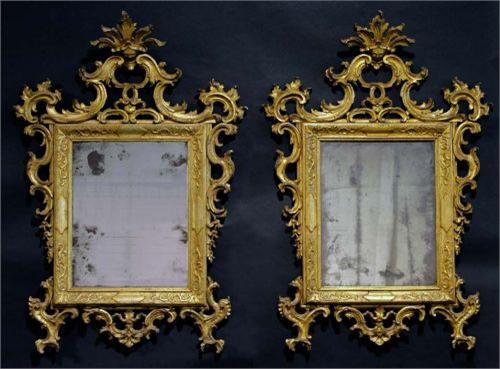 1 PAIR OF EXCEPTIONAL ITALIAN ROCOCO GILTWOOD MIRRORS 59" high, 41" wide, circa 1720, PLEASE NOTE: ANY BIDDING ON THIS LOT MUST BE DIRECTLY THROUGH THE AUCTION GALLERY. WE CAN NOT ACCEPT BIDS THROUGH EBAYLIVE ON THIS LOT. PLEASE CONTACT GALLERY FOR MORE INFORMATION, (203) 364-1555 BEFORE SATURDAY, JANUARY 28TH AT 3PM EST.