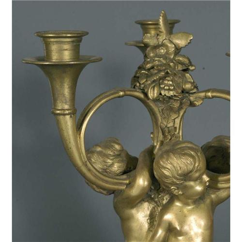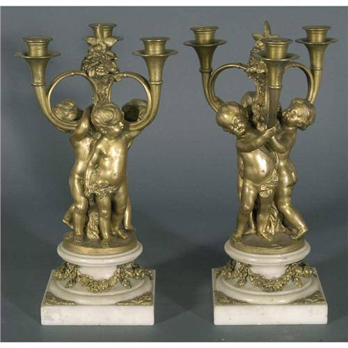 1 PAIR OF FRENCH BRONZE AND MARBLE FIGURAL CANDELABRA each with three cherubs supporting 14" high late 19th century PACKING AND SHIPPING (excluding insurance) by Fairfield Auction to points within the Continental U.S.A. (international must be handled by 3rd party shipper) $60. CONDITION REPORT: excellent, adapted later for electricity, wire now cut.
