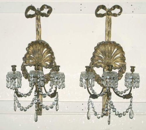1 PAIR OF LARGE AND IMPRESSIVE GILTWOOD SCONCES, shell carved with crystal drops, 36" high, circa 1900, surfaces faded and flaking and with splits, some crystal drops lacking, BUYER MAY PICK-UP OR USE A 3RD PARTY FOR PACKING AND SHIPPING