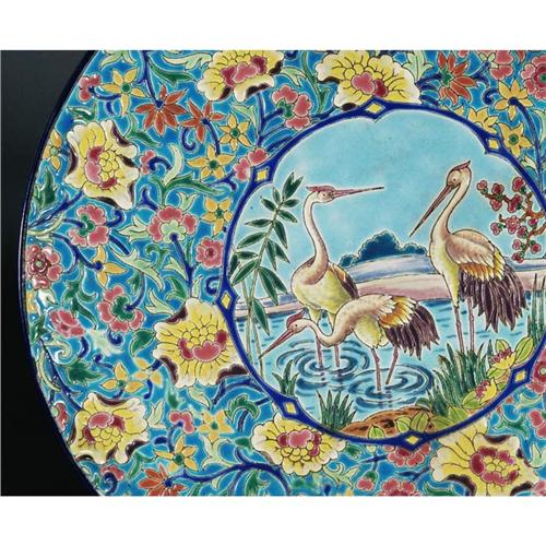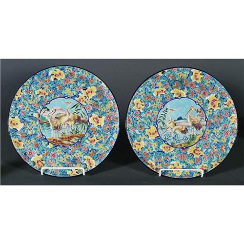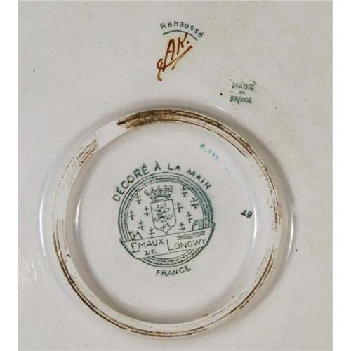 1 PAIR OF LONGWY CHARGERS each decorated with birds 14" diameter PACKING AND SHIPPING (excluding insurance) by Fairfield Auction to points within the Continental U.S.A. (international must be handled by 3rd party shipper) $40. CONDITION REPORT: one with 3" repair on edge, 1/2" chip to footed base, stains overall.