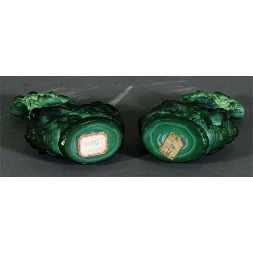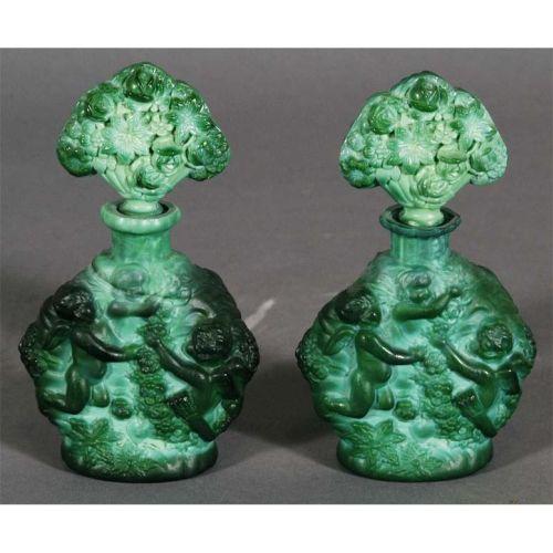 1 PAIR OF MALACHITE GLASS<BR>PERFUME BOTTLES, each 6 1/2"<BR>high, circa 1930, <BR>CONDITION REPORT: excellent.<BR>PACKING AND SHIPPING (excluding insurance) by Fairfield Auction to points within the Continental U.S.A. (all other international must be handled by 3rd party shipper) $30.