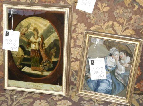 1 PAIR OF REVERSE PAINTED GLASS PAINTINGS, Plenty, 14"x10"and Gossip 10"x7 1/2"(glass only),