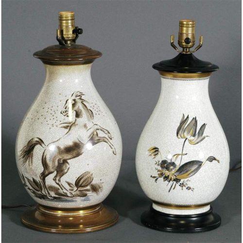 1 PAIR OF ROYAL COPENHAGEN LAMPS<BR>each decorated over a<BR>"crackle" glaze adapted from<BR>vases<BR>13" and 12" high vases alone<BR>mid-20th century <BR>CONDITION REPORT: excellent.<BR>PACKING AND SHIPPING -see recommended.