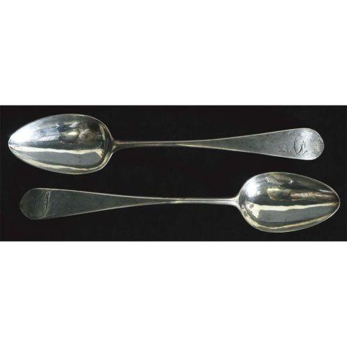1 PAIR OF SAMUEL BURT SILVER<BR>SERVING SPOONS<BR>each 9 1/4" long<BR>Boston<BR>circa 1750 <BR>CONDITION REPORT: light scratches from use.<BR>PACKING AND SHIPPING (excluding insurance) by Fairfield Auction to points within the Continental U.S.A. (all other international must be handled by 3rd party shipper) $20.