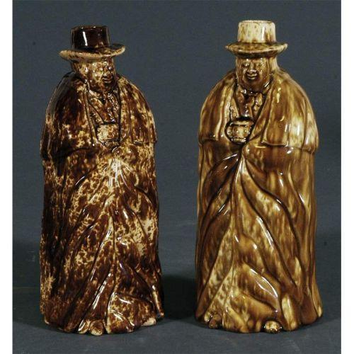 1 PAIR OF SIMILAR ROCKINGHAM<BR>FIGURAL BOTTLES<BR>each 11" high<BR>19th century <BR>CONDITION REPORT: excellent.<BR>PACKING AND SHIPPING (excluding insurance) by Fairfield Auction to points within the Continental U.S.A. (all other international must be handled by 3rd party shipper) $40.