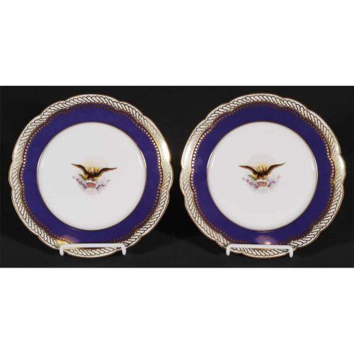 1 PAIR OF WHITE HOUSE DINNER<BR>SERVICE REPLICA PLATES<BR>Abraham Lincoln<BR>administration, 8 1/2"<BR>diameter, circa 1920<BR>CONDITION REPORT: excellent<BR>PACKING AND SHIPPING (excluding insurance) by Fairfield Auction to points within the Continental U.S.A. (all other international must be handled by 3rd party shipper) $30.