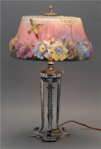 1 PAIRPOINT PUFFY TABLE LAMP, 14" floral design with hummingbirds and silverplated base