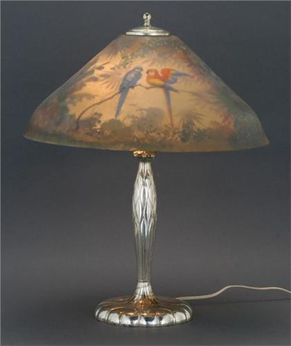 1 PAIRPOINT REVERSE PAINTED TABLE LAMP, 17" shade with tropical birds, silverplated base,