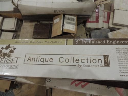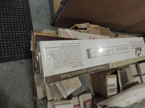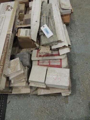 1 PALLET, 19+ BOXES ROCK & TERRA COTTA TILES & 2 BOXES OF LAMINATED HARDWOOD FLOORING. ASSORTED STYLES AND SIZES OF TILES. AS SHOWN. VIEW PICTURE FOR DETAIL.