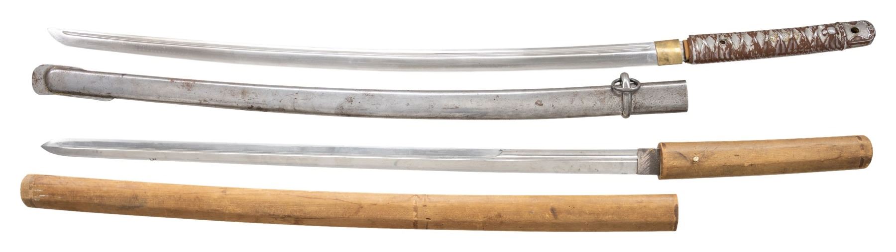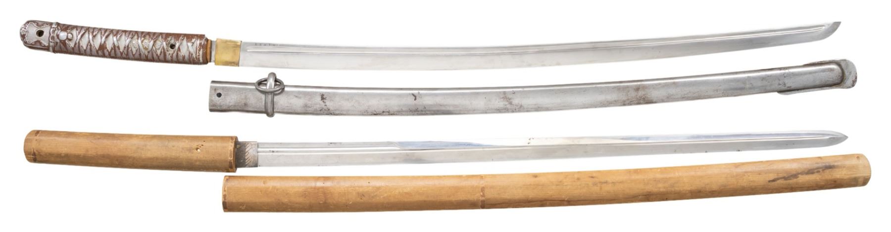 1) PARTIAL KATANA. This is an NCO katana that measures 37 1/2" overall with a 27 3/4" blade. The blade has a full length hi and is numbered "384660". The katana has a gilded habaki but no tsuba or seppa. There is no fuchi but the tsuka is intact but has no securing screw. The metal saya is plated with a single suspension ring. CONDITION: the blade is actually quite nice with an excellent polish. The existing tsuka is quite wore with most of the painted finish gone. The saya is missing the throat. 2)TSURUGI. A rare and very nice tsurugi or ken blade in a shirasaya measuring 37 1/4" overall with a 26 3/4" blade. Blade has a straight hamon with a full length narrow hi and a wider, shorter hi extending from the habaki for 6 1/8". silvered habaki with a textured lower half and diagonal spires on the top half. and a gilded copper habaki. The nakago has 2 mekugi-ana with a partial 3rd visable where the nakago has been shortened. There is a 2 character signature on one side. Classic shirasaya in lightly colored wood. CONDITION. blade has a superior polish. Shirasaya shows the usual scuffs and scrapes. (02-24101/BF). NO-GUN. $750-1500.