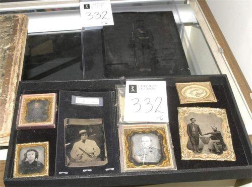 1 PHOTOGRAPHY LOT (6), including Civil War officer pouring drink, man with bowie knives and large image of soldier- all tintypes, plus two dag portraits, 2"x1 1/2" to 8 1/2"x6 1/4", mid-19th century, CONDITION: varied, see images. PACKING AND SHIPPING BY FAIRFIELD AUCTION WITHIN CONTINENTAL USA (excluding insurance) $25