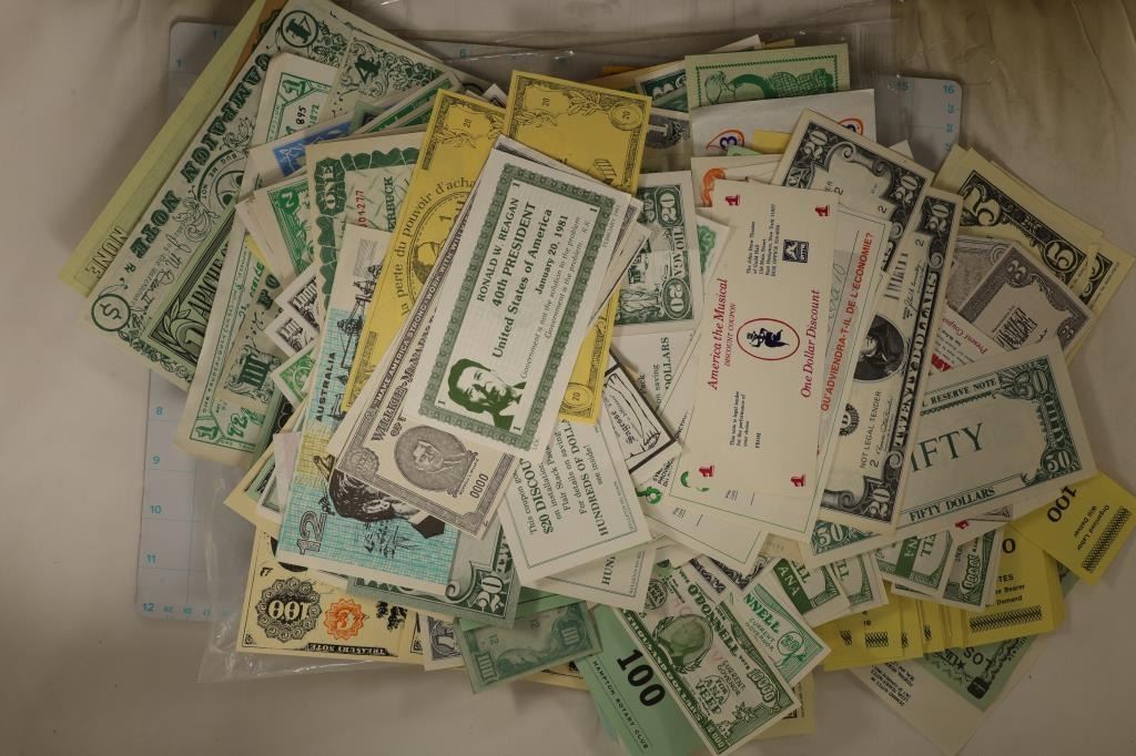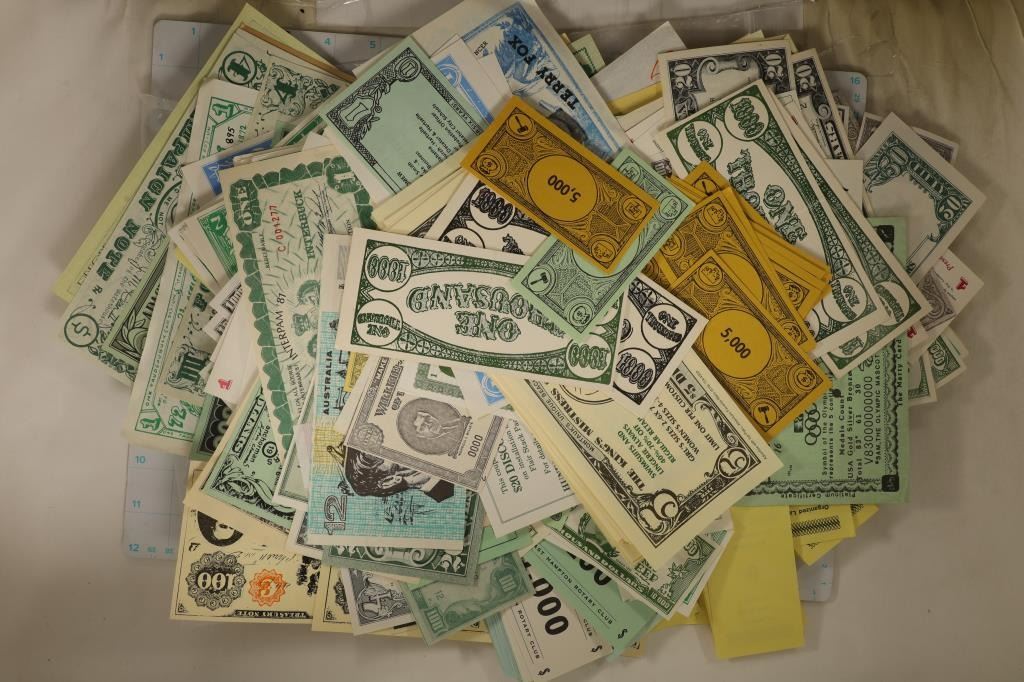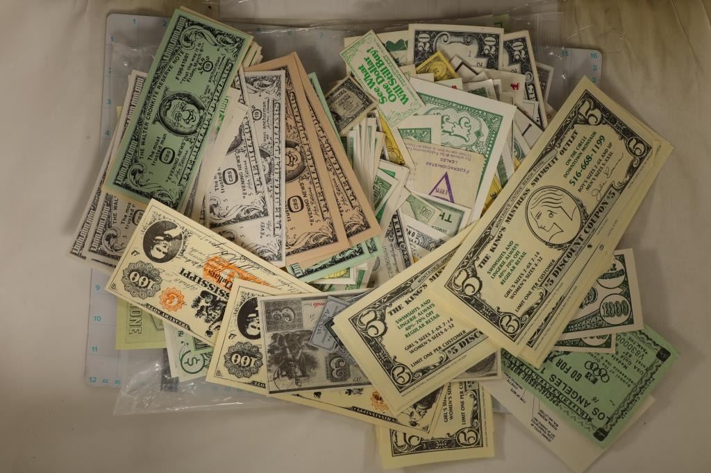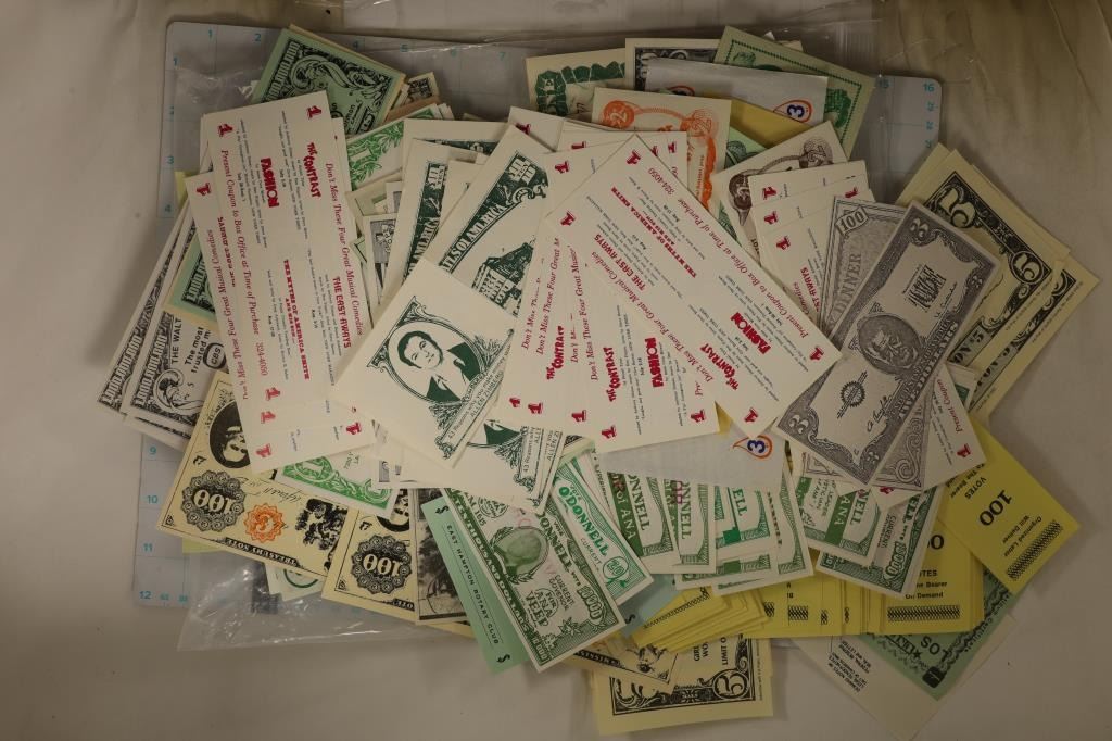 VINTAGE COUPONS, GAME MONEY, FUNNY MONEY AND OTHER UNIQUE PEICES. MOST ARE CRISP UNC AND INCLUDE ADVERTISING FROM THE U.S., CANADA, FRANCE, MEXICO, CHINA AND OTHERS.