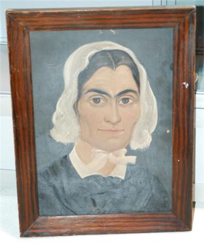1 PRIOR/HAMLIN SCHOOL PORTRAIT of a lady with bonnet 14"x10" oil on board, with the original grain painted frame, 19th century, packing and shipping $30